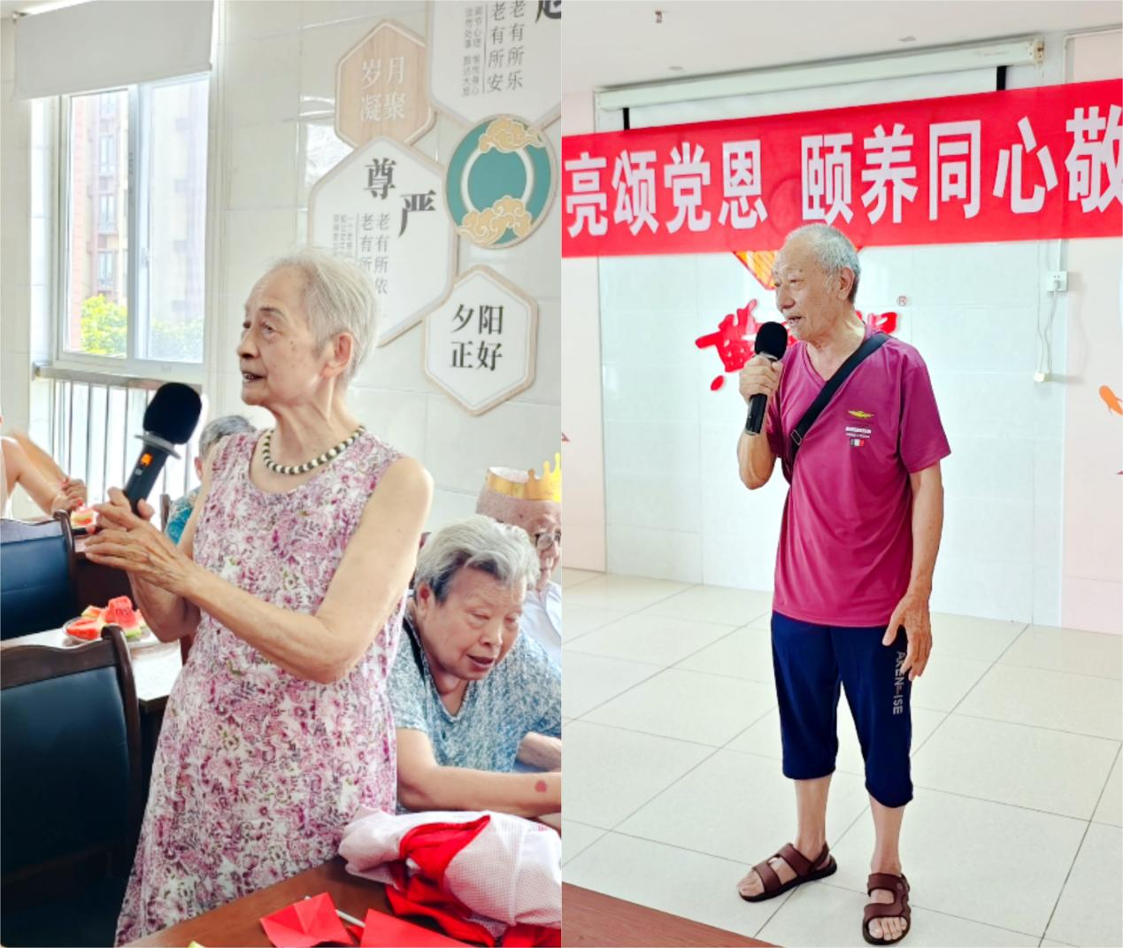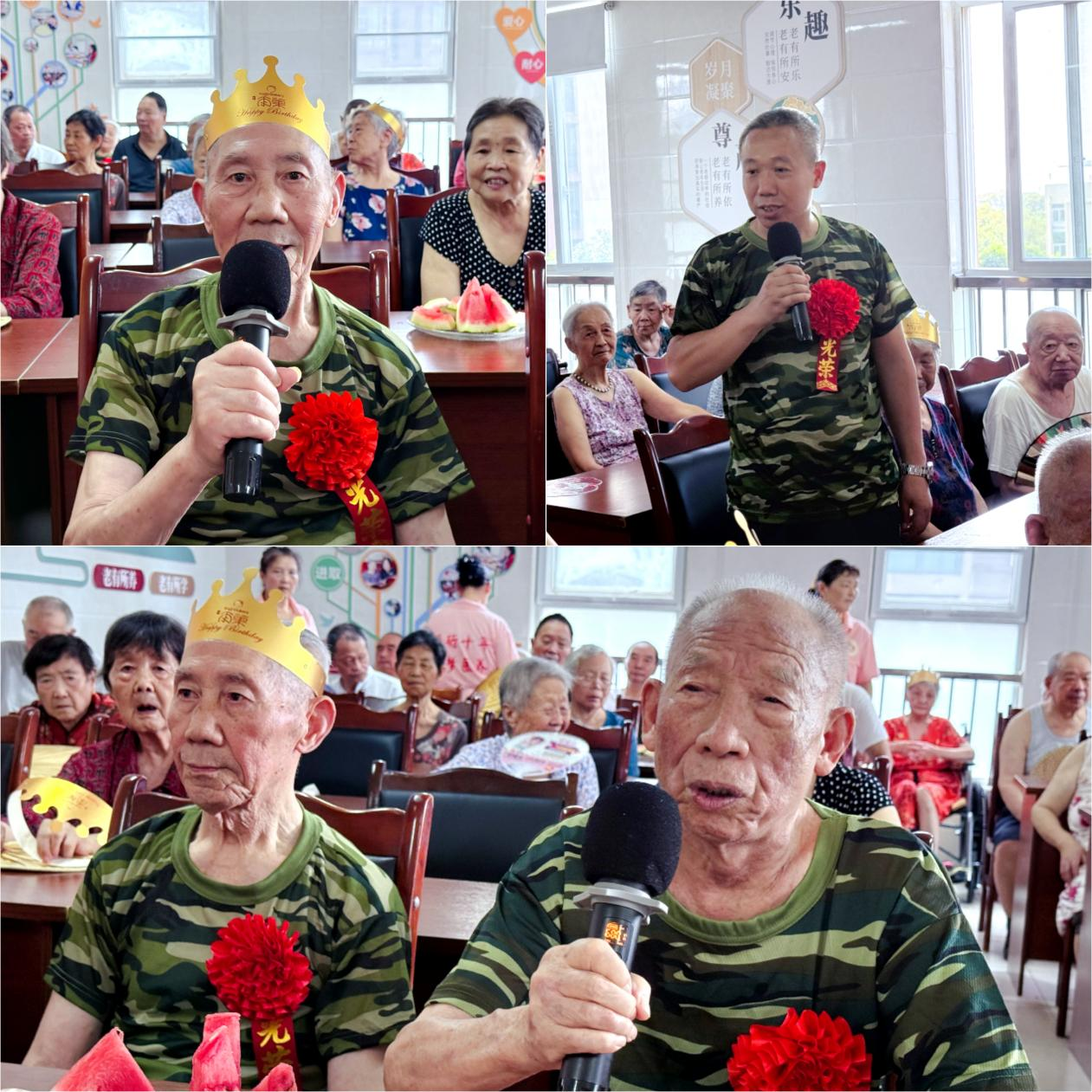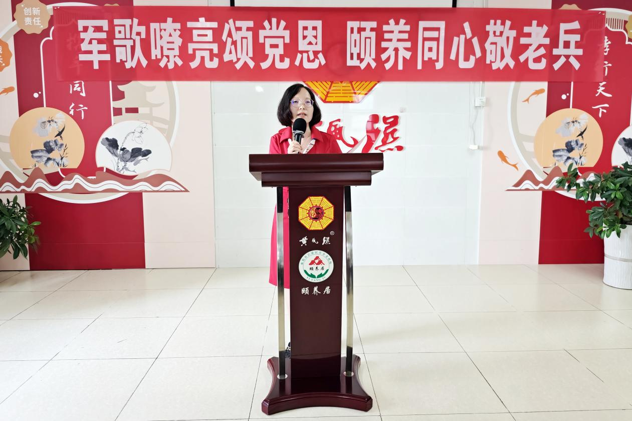 卢云华院长在致辞中向全体老兵致以崇高敬意和节日祝福,向全体七月、八月生日的长者致以真挚的生日祝贺,并深情回顾了中国人民解放军98年的光辉历程,高度赞扬老兵们“退役不褪色”的军人本色和在颐养居展现的榜样力量。她说:红阳颐养居始终把尊重老兵、关爱老人放在心上。你们的奉献,国家不会忘记,人民不会忘记,我们红阳颐养居更不会忘记!愿今天的歌声能唤起您最美的回忆,愿此刻的欢笑能温暖您的心房。也希望各位长辈在颐养居的每一天,都能如今天这般舒心、开怀! 致辞结束后,卢云华院长为老兵们朗诵了一首原创的诗:“当年,你们用钢枪守护黎明;如今,我们用双手托起夕阳。从战场到田园,从青春到白发,你们依然是我们最挺拔的‘不老松’!”。